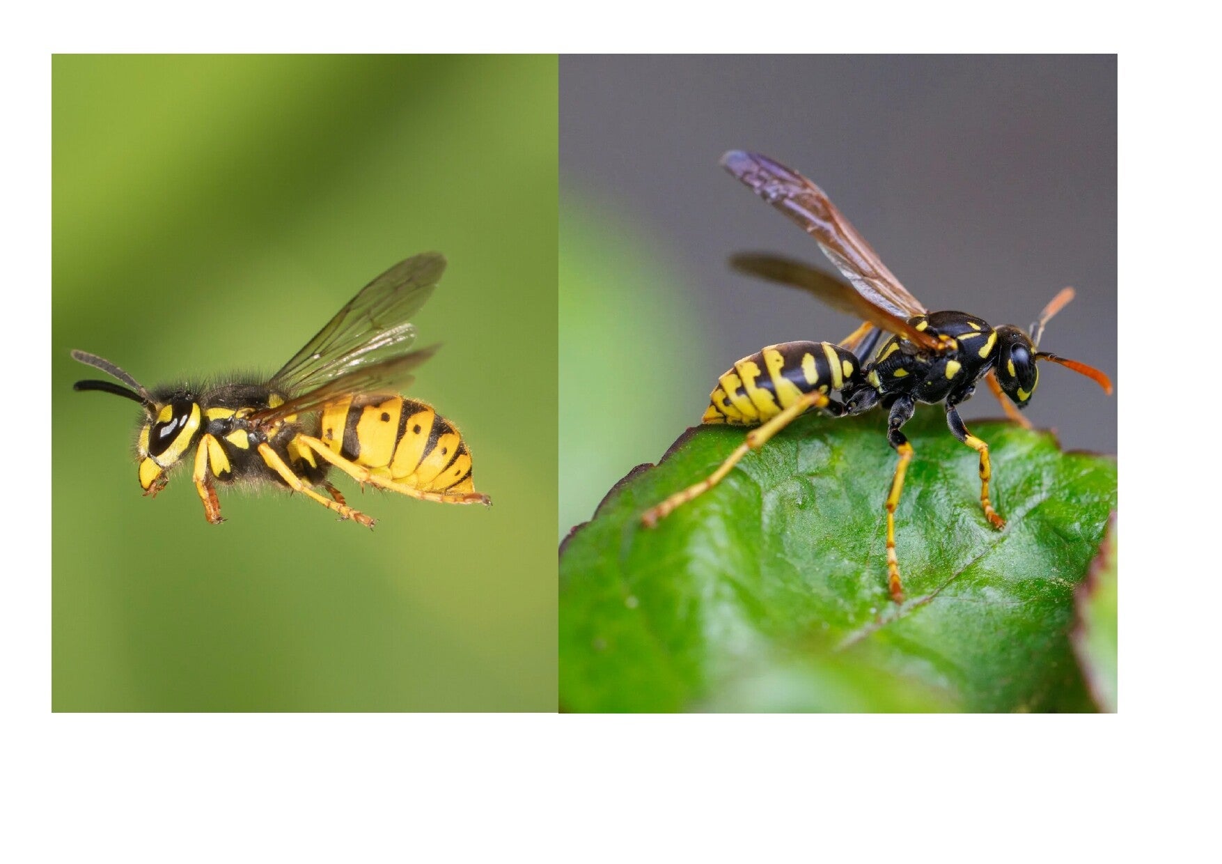 Les deux types de guêpes les plus réputés sont la guêpe commune, à gauche de l'image (Vespula vulgaris), et la guêpe Germanique, à droite de l'image (Vespula germanica). Elles sont plus agressives, et peuvent attaquer en groupe si elles sentent leur nid menacé.